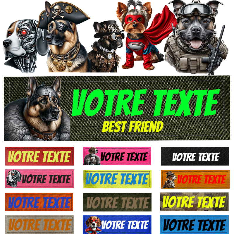 - Personnalisation du Texte : Ajoutez jusqu'à deux textes de votre choix. Que ce soit le nom de votre chien, un message d'avertissement ou une phrase ludique, faites-le ressortir !